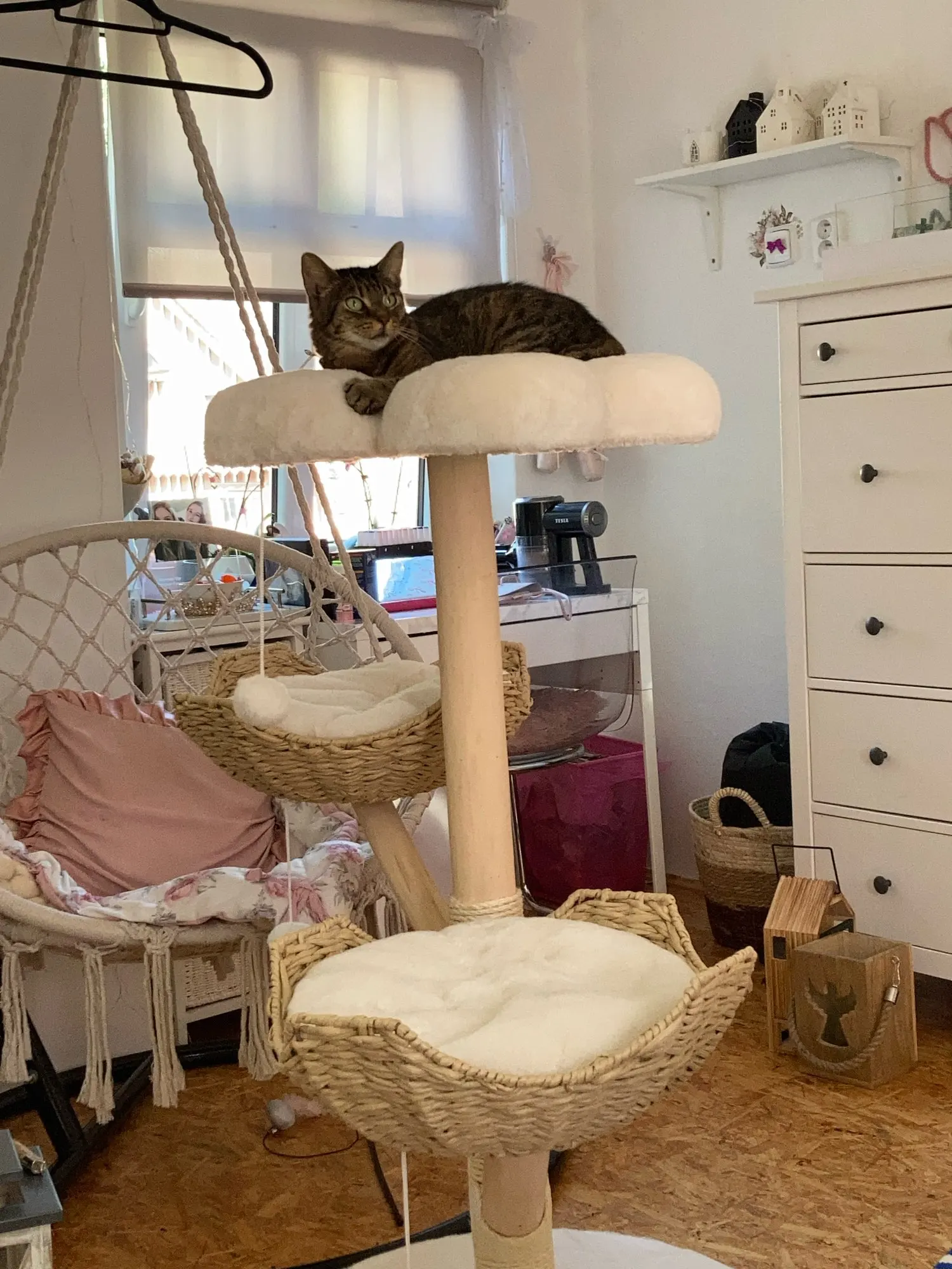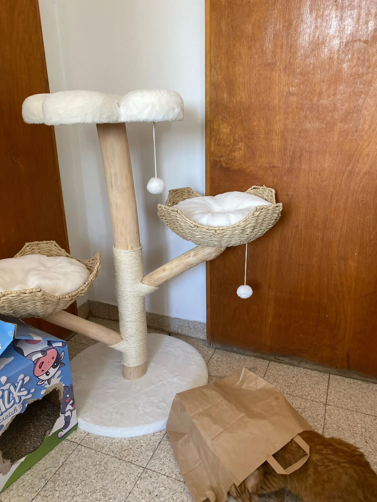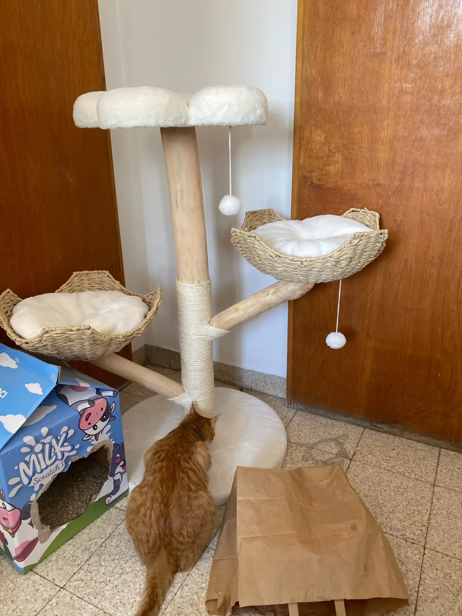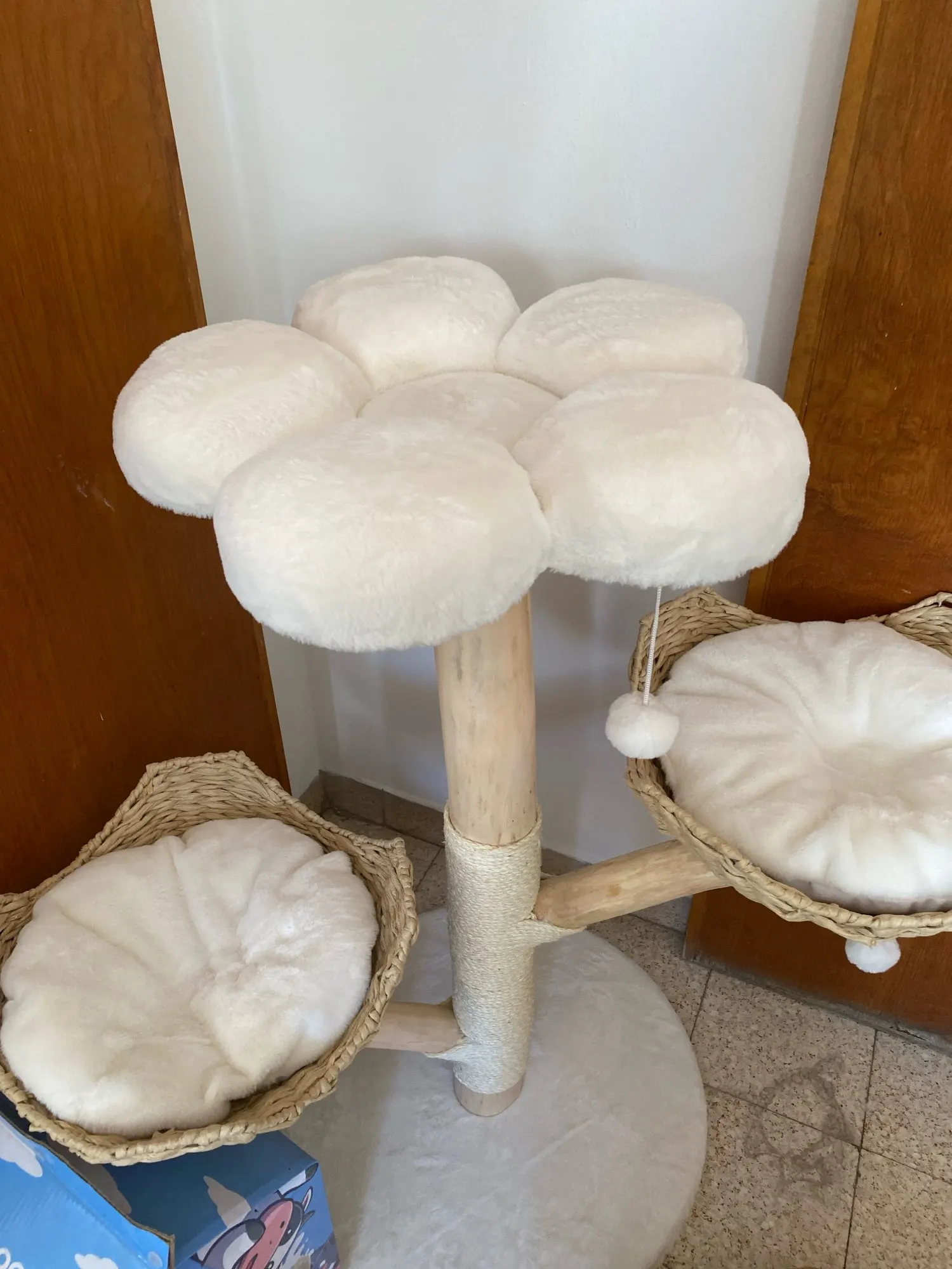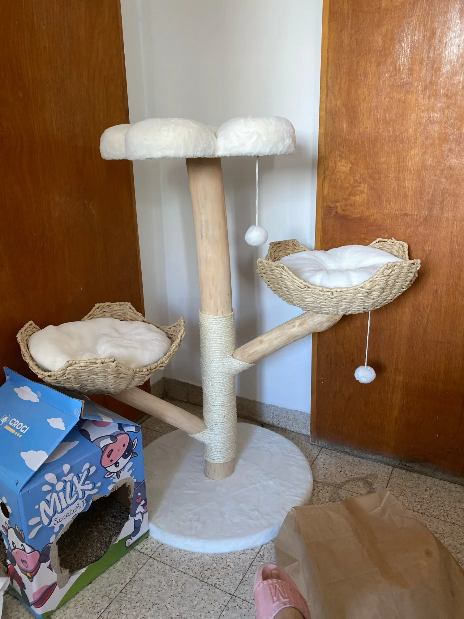 Je suis TELLEMENT heureux. Je l'aime. Le bois naturel avec du blanc ivoire est superbe. Ça a l'air si mignon. Facile à monter et semble stable. La taille convient même aux gros chats, contrairement à de nombreux arbres moins chers qui ont tendance à ne convenir qu'aux chatons. J'avais peur de commander quelque chose d'aussi cher car le système de litige d'Ali n'est pas fiable pour protéger le client, mais cela a très bien fonctionné. Livraison très rapide. Le seul problème est que les oreillers sont grumeleux et seulement très légèrement rembourrés. J'aurais pu utiliser plus de coton.