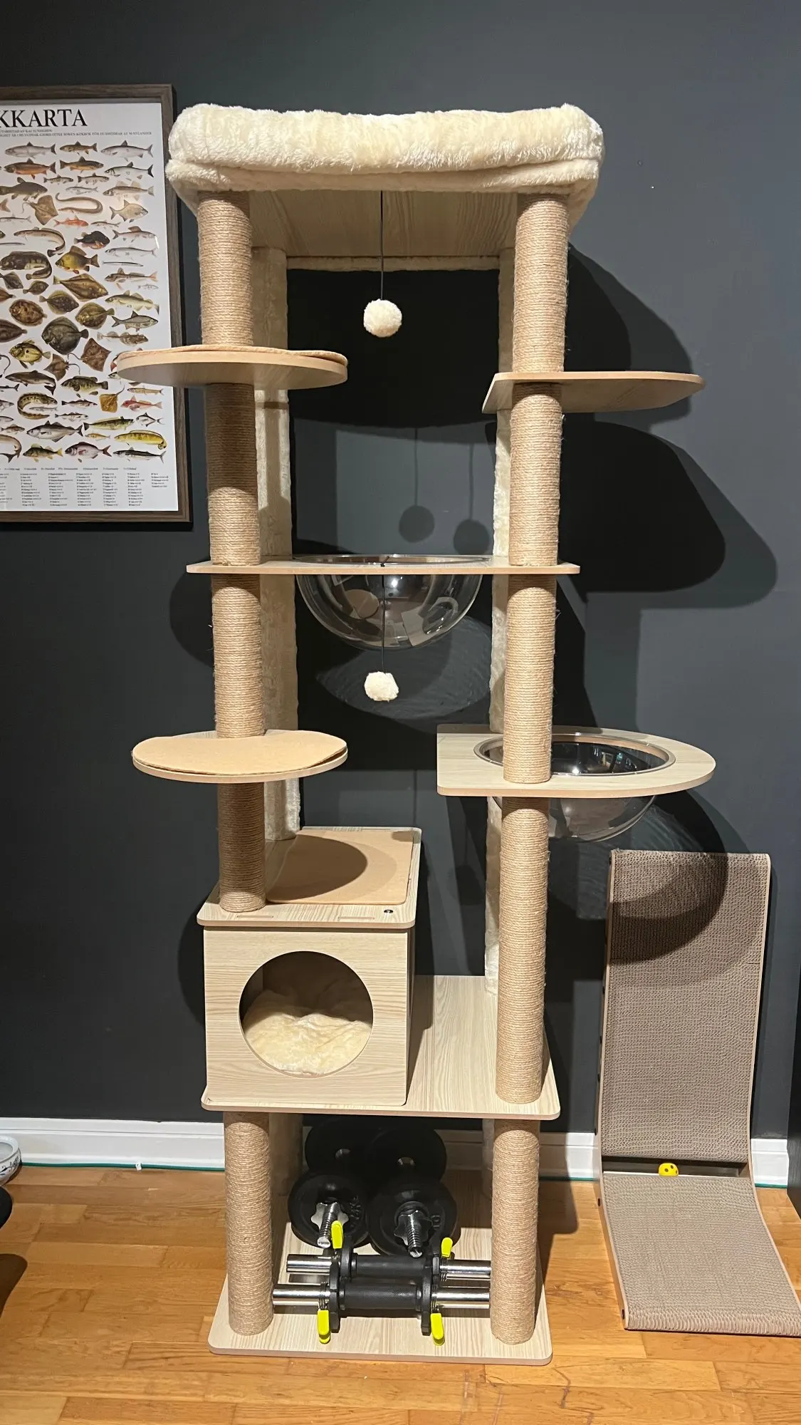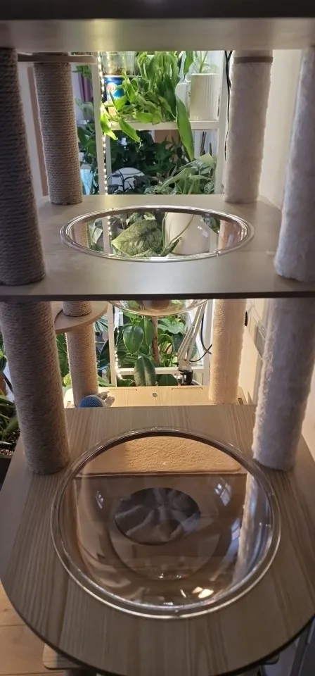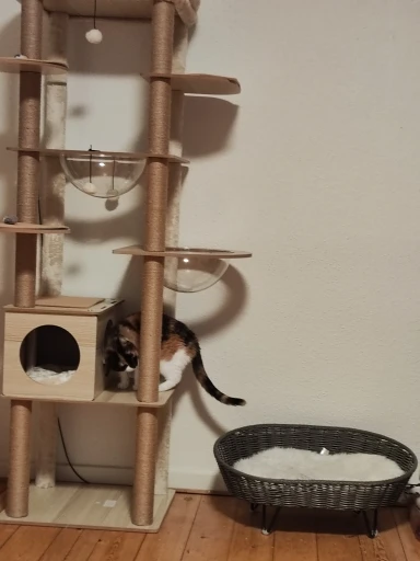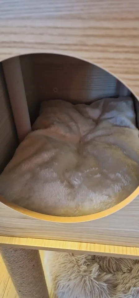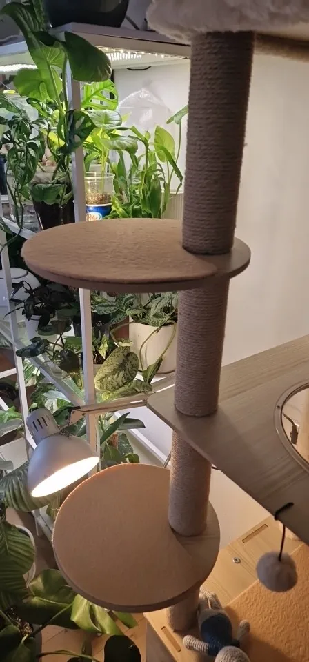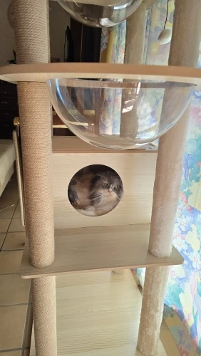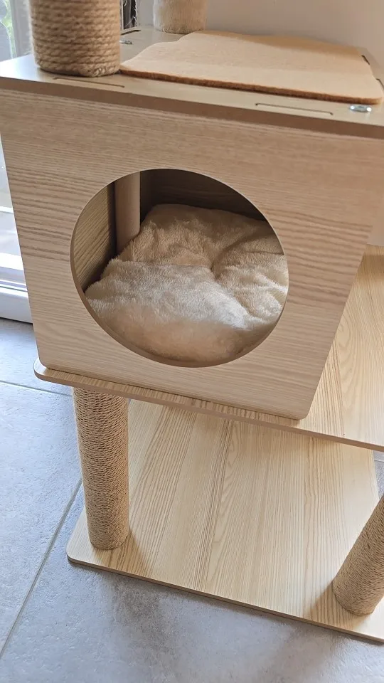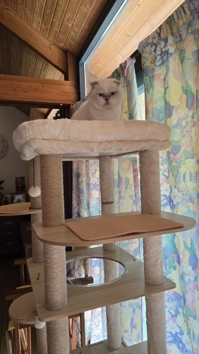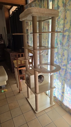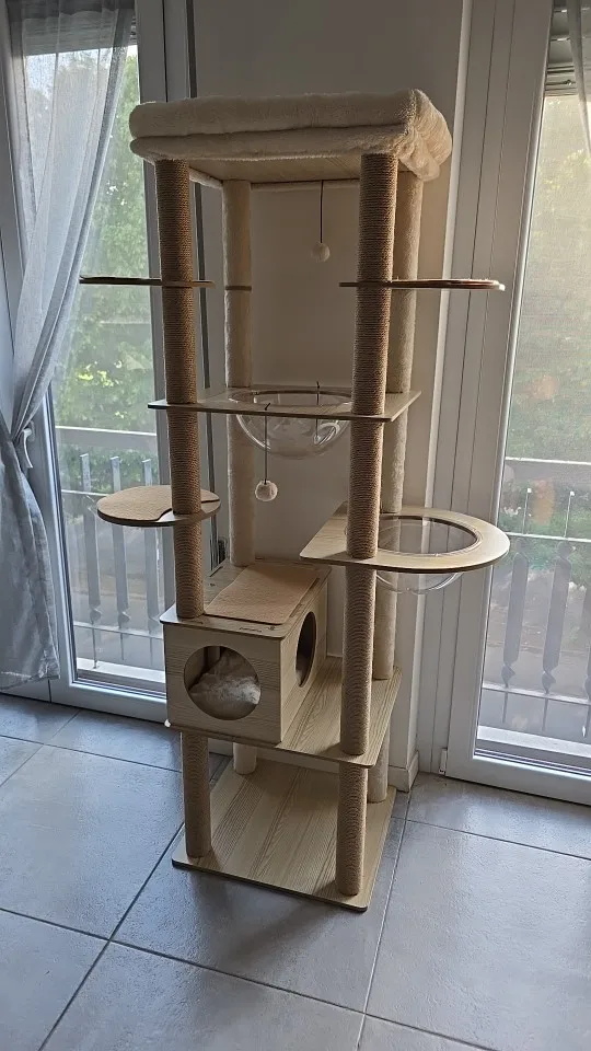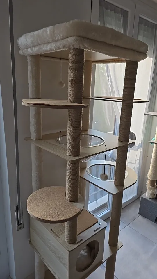 Cet arbre à chat est vraiment bon et solide. Mon chat l'a adoré dès le début ! Au début, c'était un peu bancal car je ne pouvais pas percer le mur, mais j'ai placé un haltère et quelques poids en bas, et maintenant c'est super stable. Les coussins peuvent être facilement retirés pour le nettoyage, ce qui est très pratique.